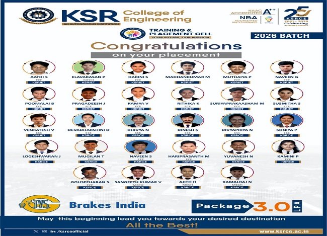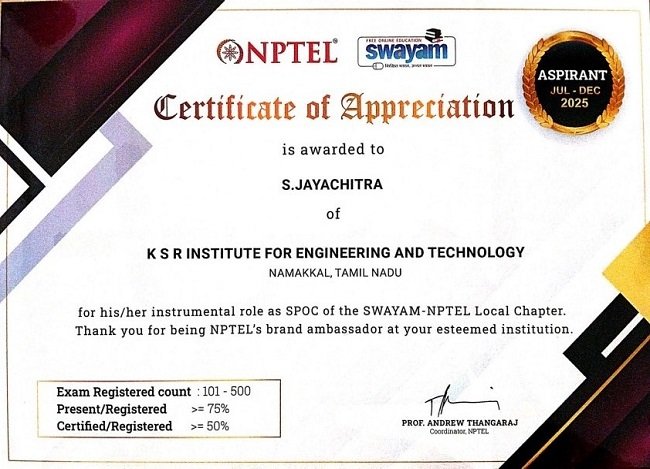 K.S.R. College of Engineering is a friendly environment for knowledge development which provides huge opportunities. The curriculum is also rigorous and comprehensive, offering a perfect blend of theoretical knowledge and practical experience. The faculty members are not only experts in their fields but also genuinely invested in the success of their students. Overall, my experience at K.S.R. College of Engineering has exceeded my expectations. I have grown both personally and professionally, and I am confident that the education and experiences I have gained here is guided me up to this level