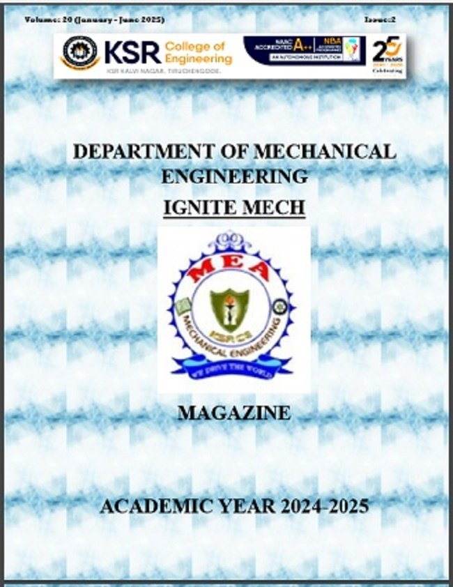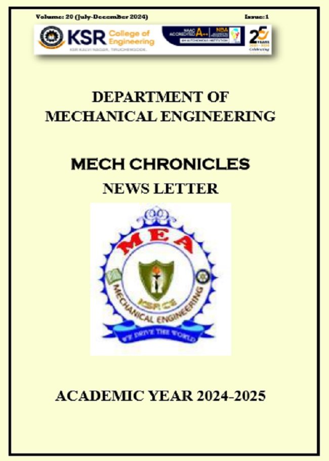 Welcome to the Department of Mechanical Engineering at K.S.R. College of Engineering, Tiruchengode. The Department has been a hub for quality education and innovation in the field of Technical Engineering and it has started functioning from the year 2005 duly approved and affiliated by the Anna University, Chennai with the intake of 120 students.