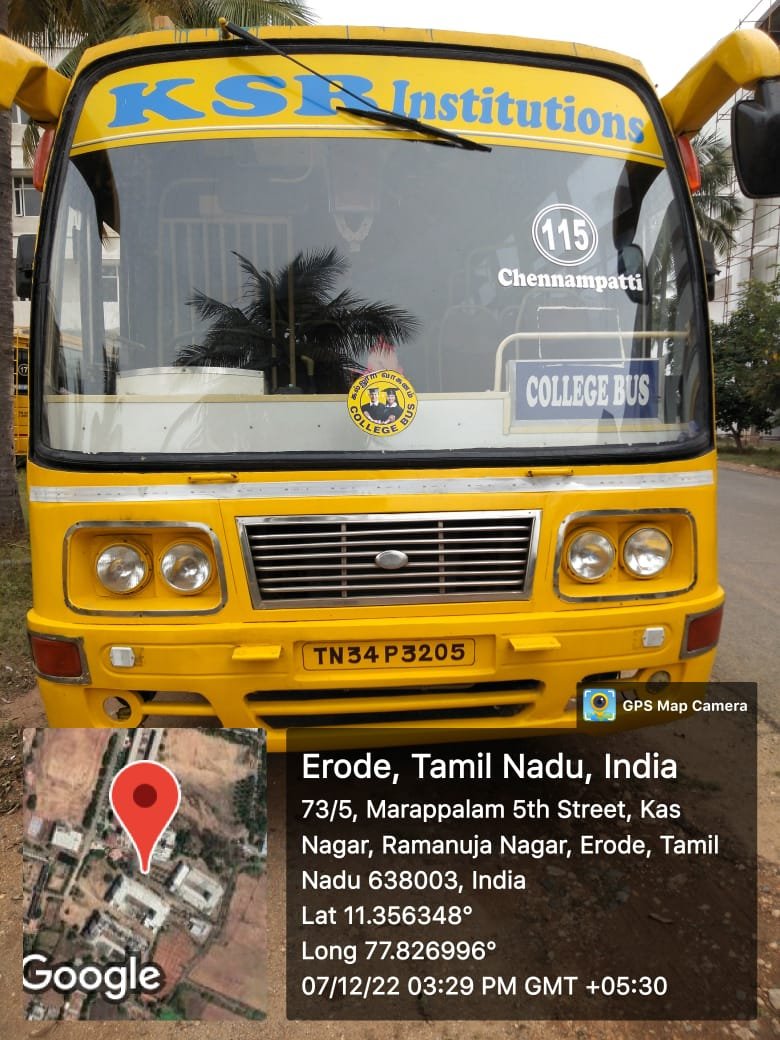 The K.S.R. Educational Institutions operates more than 167 buses for the benefit of the students nearly 100 KM radius from the various districts – Attur, Kolathur, Vaazhapadi, Satthiyamangalam, Namakkal, Erode, Salem, Karur and Tirupur. It gives a platform for the rural students to get quality education. This Bus Facilities are provided to all Students, Faculty members and Staffs of K.S.R. Educational Institutions.