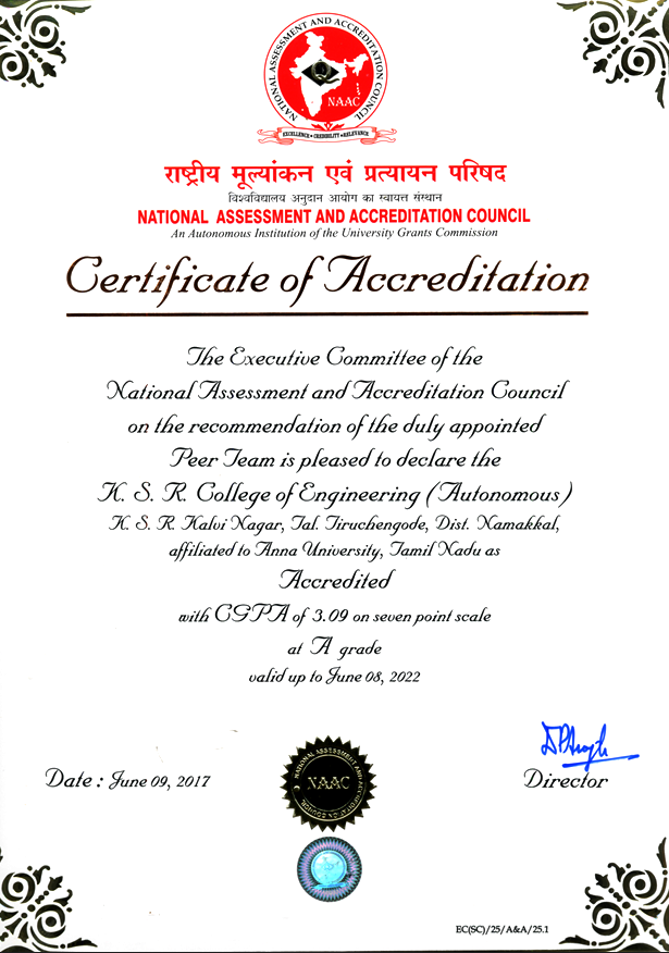 The National Assessment and Accreditation Council (NAAC) is a public autonomous body of the government of India that assesses and accredits higher education institutions (HEIs) in India. It is funded by the University Grants Commission. The National Assessment and Accreditation Council (NAAC) assess the higher education institution on implementing quality initiatives and measures to enhance the quality of education in HEI. K.S.R. College of Engineering has undergone two cycle of NAAC accreditation proces and has received the highest grade of A++ from NAAC.
